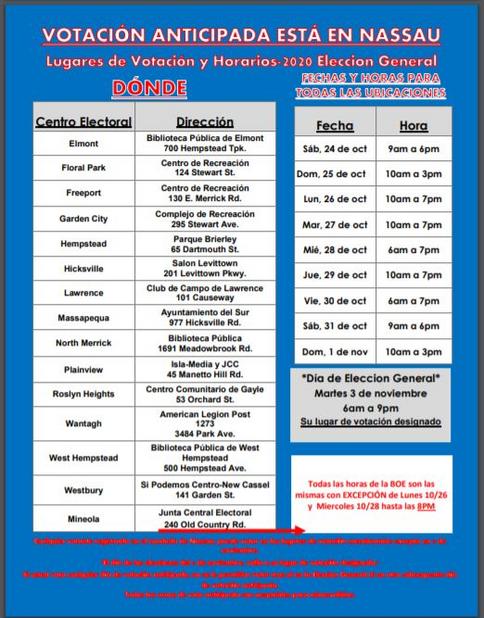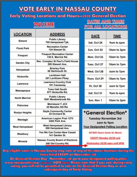 You may mail your absentee ballot to the Nassau County Board of Elections using the return envelope provided. You should mail your ballot back as early as possible. You may instead choose to drop off your absentee ballot at the Board of Elections office in Mineola (240 Old Country Road, 5th Floor)during normal business hours, or at any early voting polling place or election day polling place in Nassau County during the hours the polls are open.